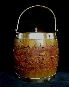 Barrel shaped, oak, carved leaves and vines, silver plate mounts and lid. Interior porcelain container.