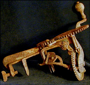 Description: An old peeler with cogs and gears and rust for decorative appeal.