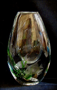 Description: Beautiful Swedish crystal vase by Kosta Boda features etched fish and brilliant green seaweed accents.