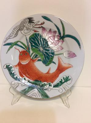 Description: Antique Chinese Set of 6 Porcelain Enamel Dinner Plates, 10" Dia with hand painted Koi Fish,Crane and Lotos Flower, circa 1880, marked on the bottom. Very good condition for the age, some minor lost of enamel on the plates.
