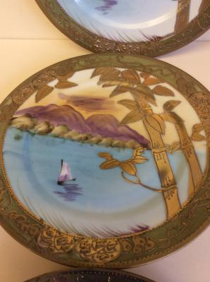 Description: Antique Japanese Kutani Porcelain Set of 6 Plates, 6.5" Dia with hand painted Seascape in the center and thick gold relief paint on the boarder. Marked "Nippon" hand painted on the back. This mark was in use from 1890 to early 1920. Very good condition.