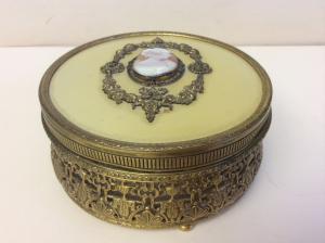 Description: Rare to find in such excellent condition Victorian Era Glass Jewelry Box richly decorated with gold plated filigree around the main body and hand carved shell Cameo on Yellow Enamel top cover. inside the cover there is a signage,dedication words: "To my wife on our first wedding anniversary. May 11,1934". Measures: 2.5" H and 4.5"Dia