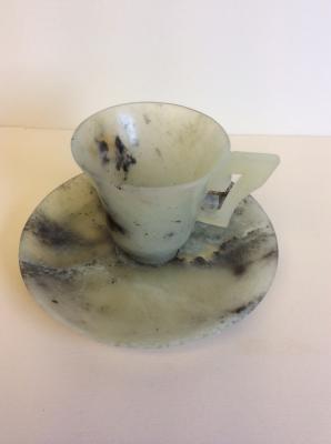Description: Antique Chinese Cup and Saucer hand carved of Natural Translucent Jade that has some black inclusions. The cup carved from one piece of Jade, the saucer too. The swirls of dark, called by Chinese "butterfly" reflects unique aspect of Jade and makes Jade pieces of Art so special. Early 20th century. The cup measures 2 1/4" H x 2.5" W; the saucer is 4.5" Dia. Excellent condition.