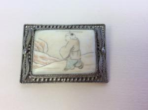 Description: Antique Chinese Sterling Silver Filigree Brooch with Genuine Ivory Hand Painted Central Inset, circa 1900. The Brooch features Walking man in mountainous landscape. Good quality work dated to the turn of the century. measures: 1" H x 1.5"W