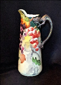 Description: Willets Belleek Pitcher with dragon figure applied handle.Approximately 11 inche height. Hand painted grapes and foliage.