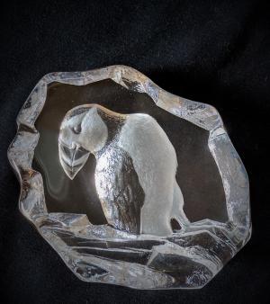Description: Swedish crystal etched with beautiful puffin design. Artist signed by Mats Jonasson. Made in Sweden. Excellent condition.