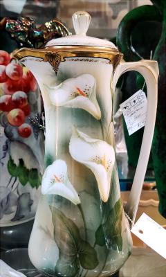 Description: Chocolate pot with peace lily decoration, hand painted. Marked R.S. Germany. Excellent condition