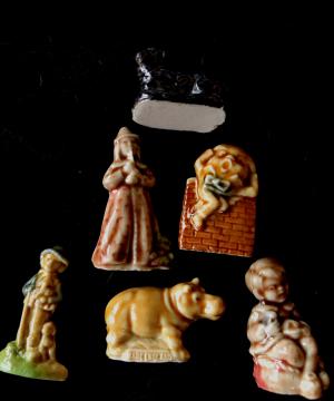 Description: An assortment of Wade figurines from the Red Rose Tea Whimsies. Includes Humpty Dumpty, Pied Piper, Li'l Jack Horner, Little Boy Blue shepherd, rhino, black sheep.