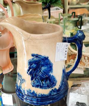 Description: Pitcher made by the Sleepy Eye/Western Pottery featuring the Indian chief and teepees. 8 1/2"h Some hairline cracks at top, some shallow chips along lower edge, crazing present.Please check out the photo.