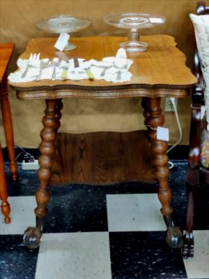 Description: Table with under shelf, turned legs, and ball and claw feet. Oak. 30.5"hX 28"x28"