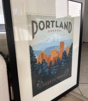 THIS ITEM HAS BEEN MARKED AS SOLD Description: Large, glass framed Portland, Oregon print. Do you have a passion for the City of Roses? Fall in love with the luscious colors in this proud PNW piece!