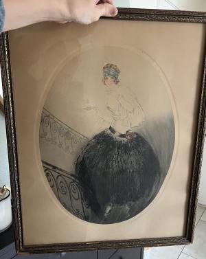 THIS ITEM HAS BEEN MARKED AS SOLD Description: Take in this beauty! Vintage Gibson Girl inspired image. Framed in glass. The contrast of the understated pop of blue in her headband and the bold black skirt, combined with the mischievous expression, creates an eye catching ethereal image.