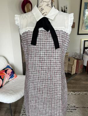 Description: Embrace playful charm with this SHEIN shift dress, a modern take on the classic school-girl style. This dress features a tailored silhouette with a relaxed fit, ruffled edge white collar with a black bow at the neck, and skirt that falls gracefully above the knee. A touch of preppy elegance, this dress effortlessly captures youthful sophistication. SHEIN size L(which means a typical M, really).