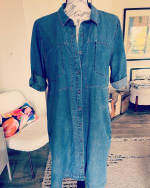 Description: This Calvin Klein denim shirt dress is a versatile piece of clothing that combines two classic and beloved staple pieces: the denim shirt and the dress! It features a button-down front, collared neckline, and a relaxed waist, creating a comfortable and stylish outfit. Size Medium.