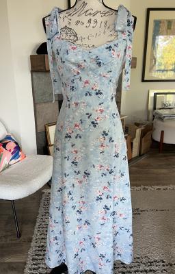 Description: The never-worn Cider brand dress is a breath of fresh air with its long, airy design in a captivating light blue hue. Adorned with delicate flower details and charming tie bow straps, this dress embodies elegance and grace, making it an enchanting choice for any special occasion. Cider size Large.