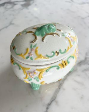 Description: This adorable white vintage sugar dish features charming and colorful detailing on its exterior, evoking a sense of nostalgia. The inside offers a sweet surprise, with its delightful pink interior, adding a pop of color and whimsy to your “spoonful-of-sugar” experience. The perfect playful decor addition to accompany your cup of coffee(or tea!).
