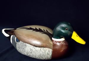 Description: Carved wood duck decoy with glass eyes. Mallard drake. Excellent condition
