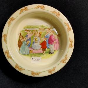 Description: Royal Doulton bowl features Bunnykins characters as illustrated by Barbara Vernon from the Beatrice Potter Peter Rabbit series. Approximately 6" diameter, 1 5/8" deep. Excellent condition.