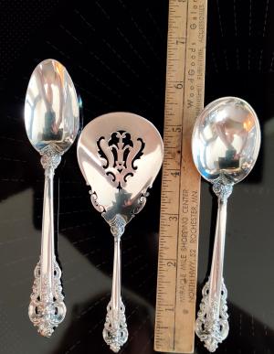 Description: Wallace Grande Baroque Sterling Pieces. One teaspoon, 6 1/8"; one round soup spoon 5 3/8"; one slotted serving spoon 5 3/8". All pieces in excellent estate condition. Individually priced.