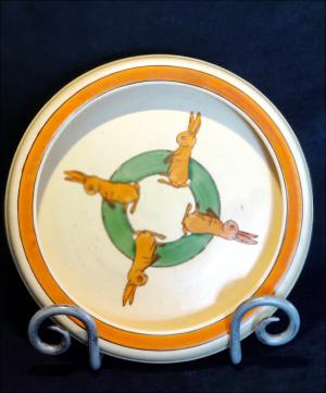 Description: Roseville child's dish with rabbits. Appoximately 7" diameter, deep dish with rolled edge. Excellent condition.e.