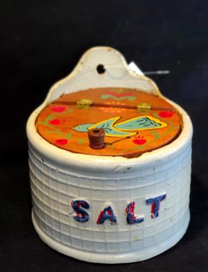 Description: a salt box with hinged wooden cover. Salt glaze earthenware with raised back having hanging hole. Overall waffle grid pattern, faded light blue bands at top and bottom, painted folk art style bird, flower & vine on cover, turned spool-like knob.