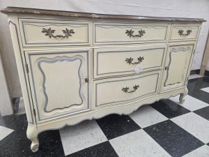 Description: Long French Provincial Sideboard. Has glass top and silverware drawer. Has some light wear from age and use. Lovely as is or refinish and make it your own.