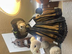 Description: Victorian bear cream colored, wearing Victorian clothing, jewelry, and glasses on a stand
