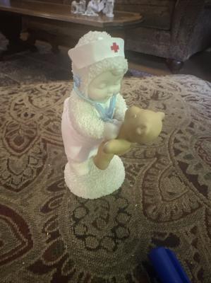 Description:Snow babies nurse holding a teddy bear