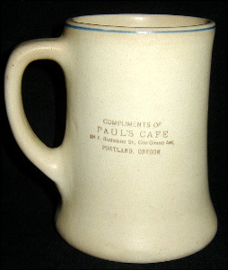 Description: A pre 1916 Roseville Pottery creamware stein features advertising from Portland! Paul's Cafe at E. Burnside and Grand. Did this stein outlast the cafe?