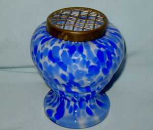 Czech glass vase features a flower frog top to hold flowers in arrangements. See it in Store Case #4 on the front aisle.