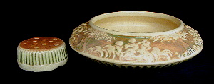 Description: Donatello pattern low console bowl, approximately 9.5" D, #90. Also have a matching #14-3 1/2 Donatello flower arranging frog. Separately priced.