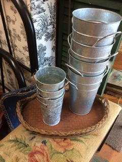 Dealer #74 has stacks of galvanized pails perfect for cut stems resting on a braided edge tray on a floral bench.