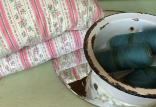 Dealer #79 groups pillows with enamel bowls and vintage etched mirrors.