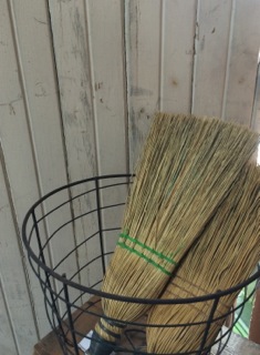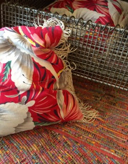 Stars Too has woven placemats and barkcloth pillows piled under a metal display.