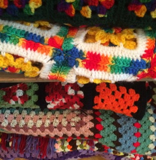 Granny square afghans fill a shelving unit in a myriad of color choices at Stars Too.
