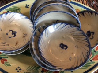 Several vintage olive trays spill over the edge of an oval serving bowl at Stars Too.