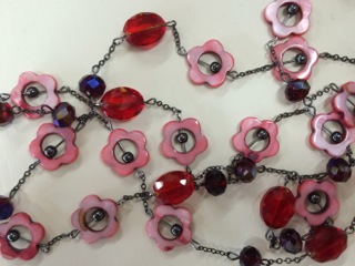 Dealer #42 drapes a necklace of small flowers and beads on a dress form; wear this doubled or tripled at the neckline.