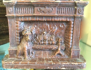 Syroco wood bookends from Dealer #40 have the finest detailed carving of a dog enjoying a warm fire at the hearth.