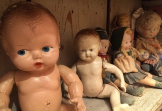 Several vintage dolls are lined up across a shelf and are waiting for love and play time at Stars Too.