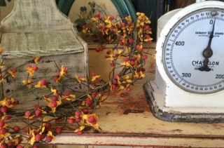A white metal scale is softened by a twisted strand of fall berries and wooden note holder from Dealer #35.