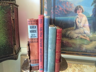 A decorative lantern sits alongside vintage books and a lovely print. Available from Dealer #31.