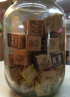 Nothing beats the combination of building blocks, alphabets, and images. Dealer #60 has this large set in a gallon jar!