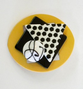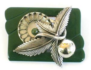 In this case it is a bakelite brooch created by Dealer 103. She has a dozen or so of these creations in her case. Each one is a unique work of art. This piece is priced at $43. We think it is a great price for a one of a kind item.