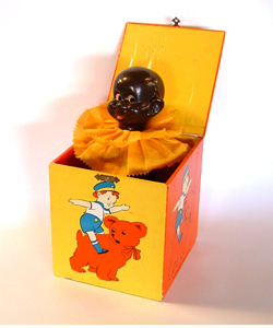 Labeled as Black in the Box, this jack in the box is an interesting toy as well as a fine example of Black Memorabilia. Dealer #79 has this toy priced at $79.00