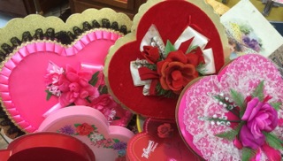Vintage Valentine boxes fill a metal cart from Dealer #69. Put your own goodies inside and bring a smile to someone's face!