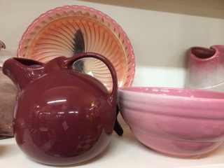 Dealer #150 shows off different shapes of vases and pitchers in all shades of pink, blush, and burgundy.