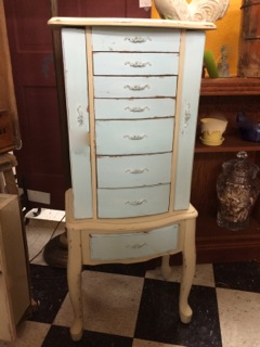 Dealer #53 has this soft robins egg blue and ivory vintage accessory armoire.
