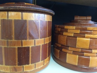 Several fabulous vintage bowls and covered pots in laminated wood from an old-time crafter fill shelves in the space of Dealer #62. Serve up something wonderful.