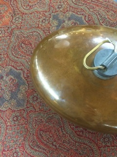 An old copper bedwarmer plays off the tones of a Fall paisley throw. Available from Dealer #113.