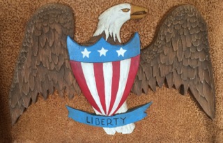 Dealer #25 hangs this handmade wooden plaque with the American Eagle.